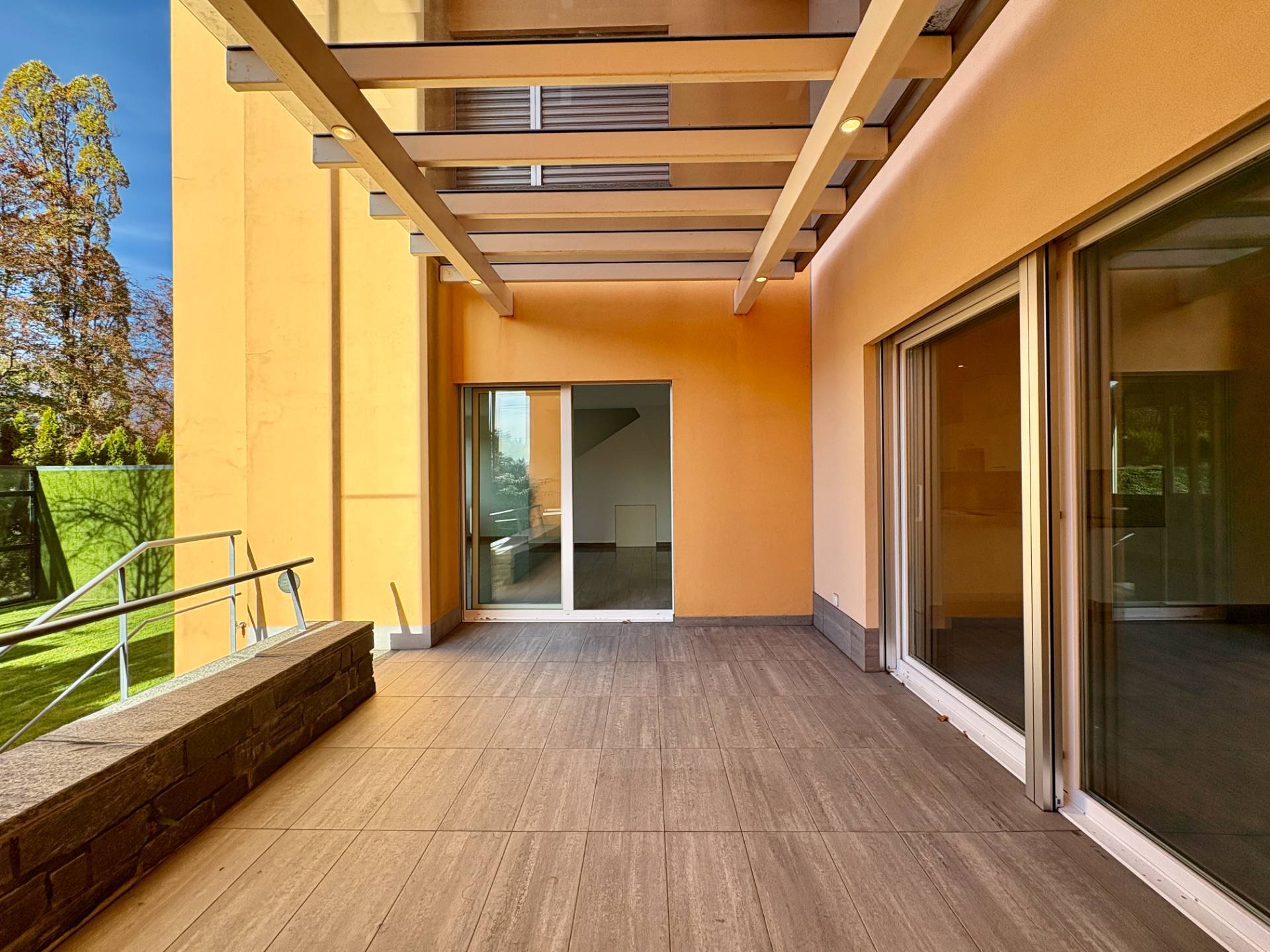 Le ampie vetrate scorrevoli del soggiorno conducono a una piacevole terrazza coperta, perfetta per momenti di relax all'aperto, che si prolunga verso il curato giardino privato, uno spazio verde ideale per famiglie e amanti della tranquillità.