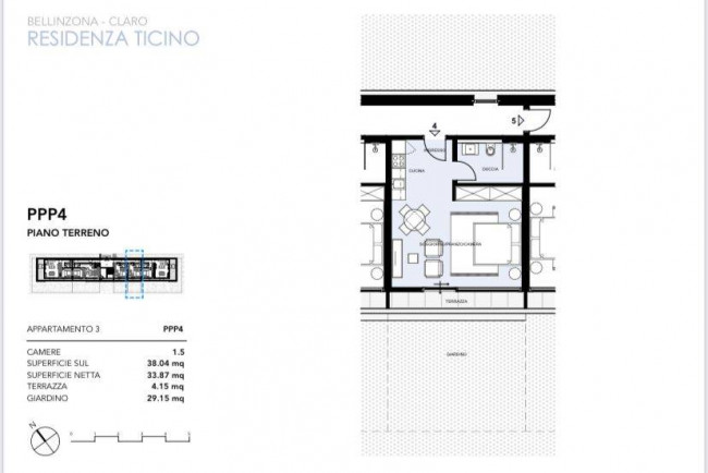 Al piano terra proponiamo un monolocale arredato composto da soggiorno/camera con moderna cucina a vista, bagno dotato di doccia. Dal soggiorno si accede al balcone e un bel giardino di 30 mq ad uso esclusivo.